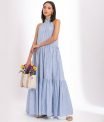 Keyhole front loop buttons and relaxed maxi dress with a standing collar and a tiered skirt. The model (Bust 34 inches, waist 28 inches) wears the size S.